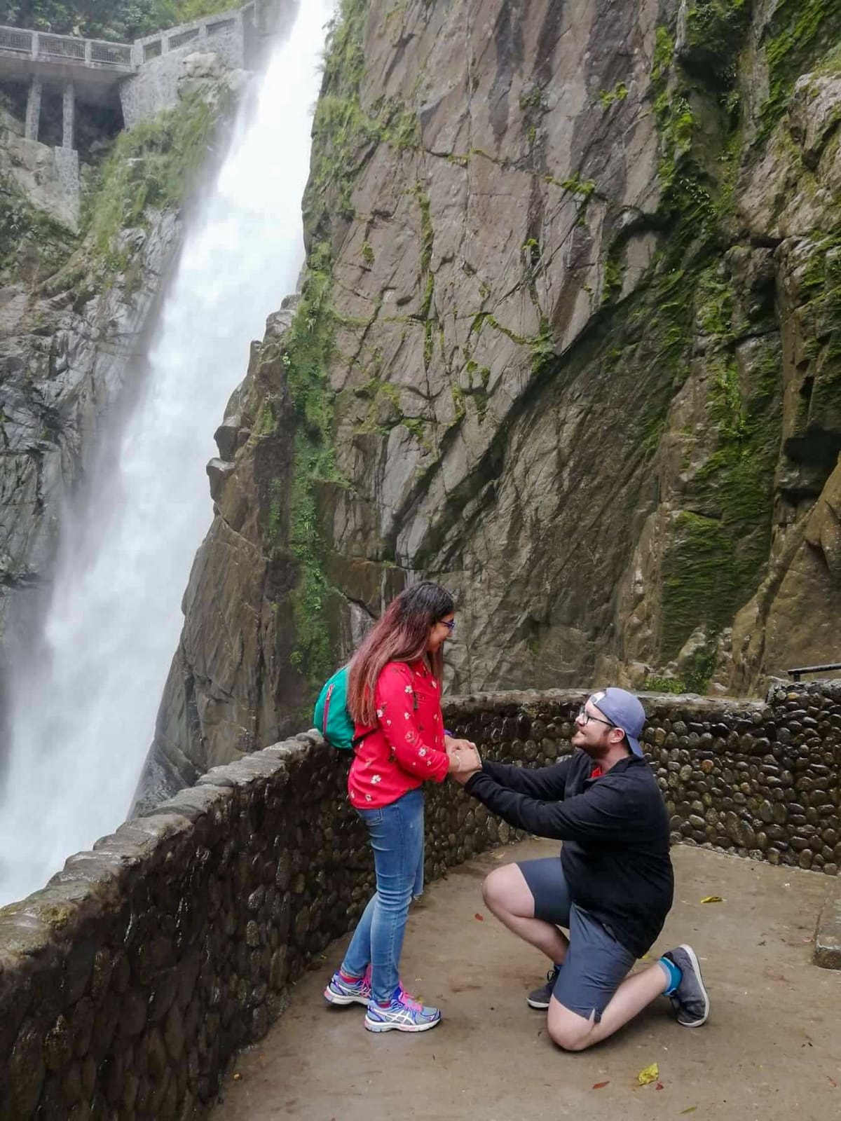 Después de visitar Cuenca y sus condominios, nos dirigimos a Baños de Agua Santa. Sin duda alguna la mejor parte del viaje, y la guinda del pastel. Baños es una población incrustada en la cordillera y rodeada de naturaleza salvaje. Cascadas, cañones, ríos...sinceramente no me esperaba semejante derroche natural. Esta zona es la meca de todo deportista de aventura, ideal para los que tienen vértigo vaya. Puenting, tirolina, rafting, rutas en buggies...etc. Nuestra aventura en Baños solo duró un día pero estuvo aprovechado al máximo. Para abrir boca cruzamos un gran cañón en una jaula, mi suegra estaba más tensa que la faja de Falete. De ahí, nos tiramos en tirolina cruzando otro cañón enorme, esta vez Kleber, Alejandra y yo a la vez y en posición de Superman. Sacando mi lado más femenino, empecé a gritar mientras sobrevolaba semejante altitud, si no eran 100 metros...no sé cuántos serían pero, pero ponía en duda que los cables soportaran mi cuerpecico serrano, que barbaridad. De ahí nos dirigimos al Pailón del Diablo, es una cascada inmensa con un mirador que quita el sentido. Aquí tuvo lugar el momento más importante del viaje, el cual supongo que no olvidaremos ninguno de los presentes jamás. Los días previos, como noble caballero, le pedí la mano de Alejandra a mi suegro en el más absoluto secreto, para dar la sorpresa. Sabía que la petición se la iba a hacer en Ecuador pero no sabía exactamente el punto exacto, ahí me ayudó mi suegro a elegir el punto perfecto, y acertó de lleno desde luego. Desde España ya llevaba el anillo, tuve que cogerle un anillo prestado sin que se enterase a la susodicha para dar con la talla, y así me lleve el anillo a escondidas hasta Ecuador. Llegados al Pailón, me quedé asombrado al contemplar aquella salvajada de cascada, la fuerza del agua producía un estruendo ensordecedor. Una vez situado en el mirador, me armé de valor y aplicando la táctica del engaño (la de atarme los cordones de los zapatos) hinqué la rodilla en el suelo y le pedí matrimonio a Alejandra...menos mal que el ruido del agua no dejaba escuchar el discurso que días antes había preparado, porque los nervios eran tales, que me quedé en blanco, diciendo frases inconexas. Supongo que Alejandra, al no escuchar un carajo, tiraría de imaginación y dijo que sí.