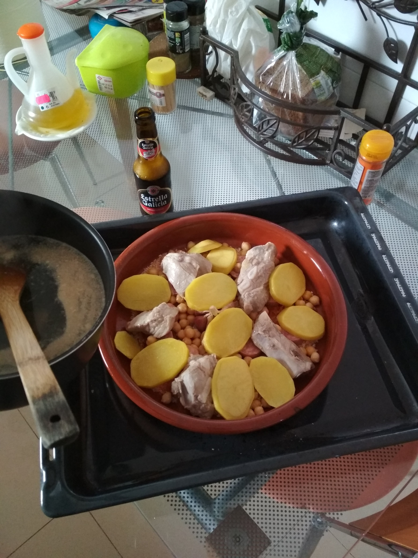 Una vez hervida la carne (solo hace falta poner a ebullición la olla por unos 4 minutos) empezamos a montar el asunto. El horno debe estar ya precalentado a 200 grados. Añadimos el sofrito al arroz en seco, nosotros se lo ponemos por encima. En el centro del barro, hacemos un hueco, apartamos el arroz, y ponemos la cabeza de ajo que previamente hemos "medio hervido), acto seguido añadimos las costillitas y los garbanzos, colocándolas geométricamente equidistantes entre sí (mientras el caldo debe estar en ebullición en la olla). En este punto añadimos unas rodajas de butifarra (aunque a nosotros nos gusta con choricillo criollo) siguiendo el mismo patrón geométrico. Una vez colocado esto, cubrimos el arroz con los trozos de patata y por ultimo añadimos el caldo hirviendo al barro.