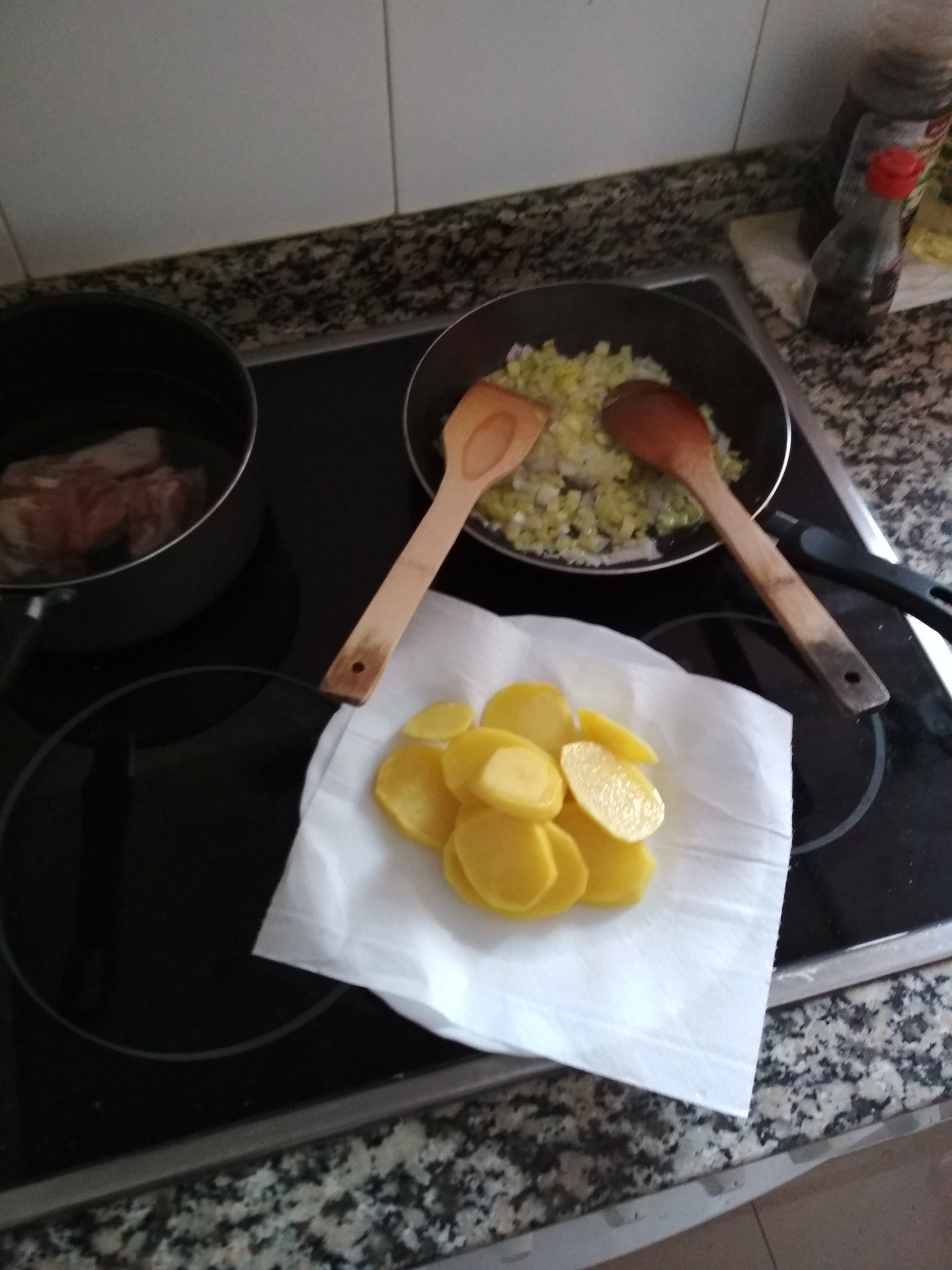 El siguiente paso, en una sartén, freímos ligeramente (es solo sellar, no freír a tope) rodajas de patata de medio dedo de grosor. Como somos fofisanos, las freímos con poco aceite, y las reservamos en un plato con una servilleta para que empape el aceite...recordamos que no se debe abusar de él.