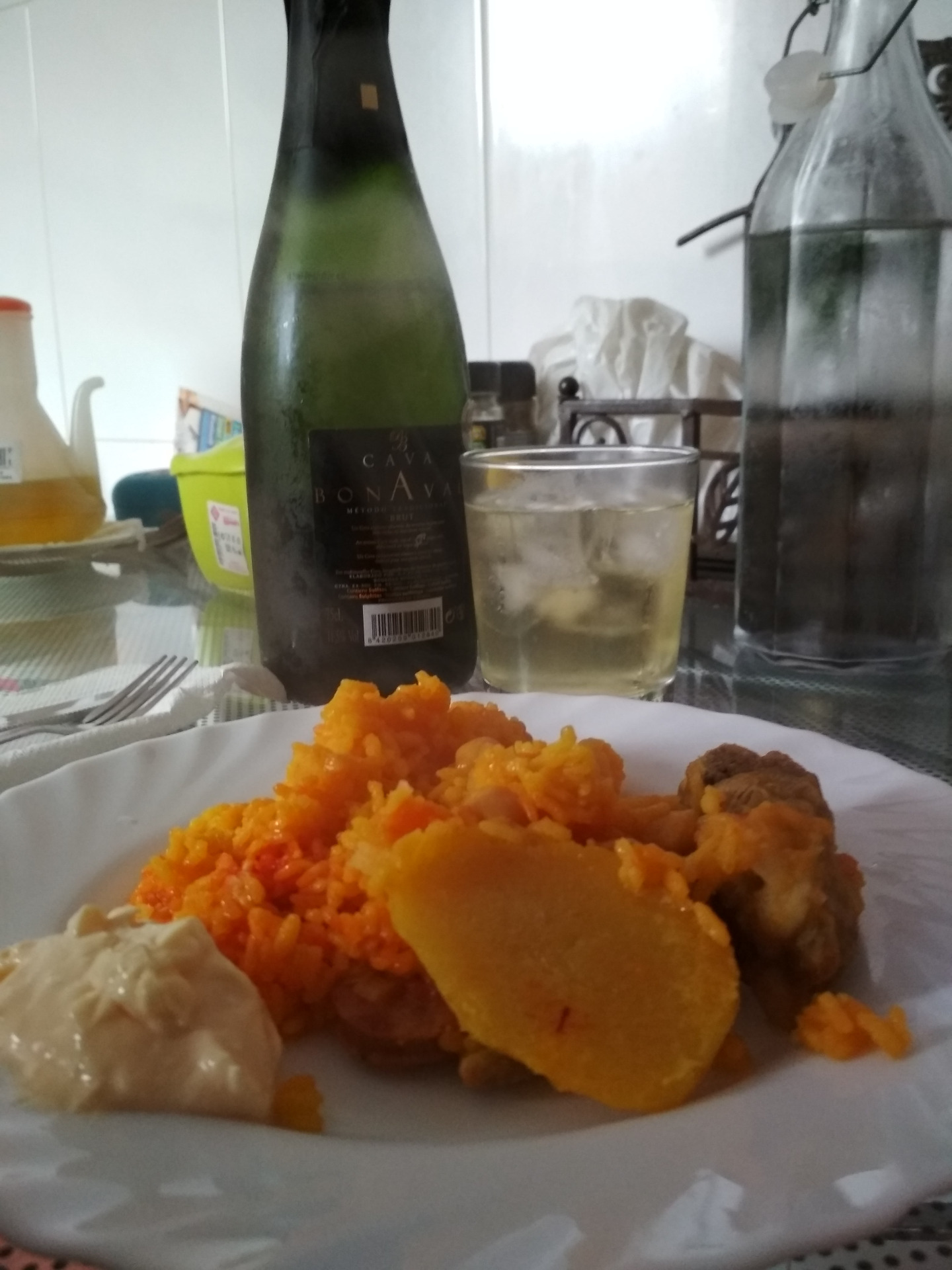 Antes de servir el arroz, la tradición manda hacer un alioli con bien de ajo. Si no supieras, cómpralo en cualquier súper, pero como el casero, ninguno. ¿Cómo se come este manjar? Primero, ponte un vaso hasta arriba de hielo y descorcha una botella de cava (así se bebe en mi familia). Llena el vaso hasta la corcha y sírvete un buen plato de arroz con toda su enjundia. En la orilla que quede libre (el plato debe rebosar por los 4 costados) añade una pella de alioli, ve cogiendo cucharadas o tenedorazos de arroz empapuzados en alioli y pa´ dentro...el orgasmo estomacal está garantizado.